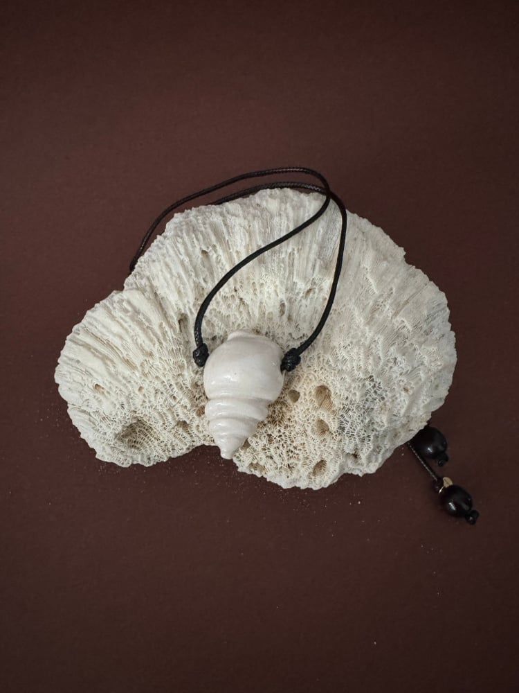 Colgante largo con una caracola realizada a mano en cerámica esmaltada en transparente brillante. Lleva un cordón encerado.